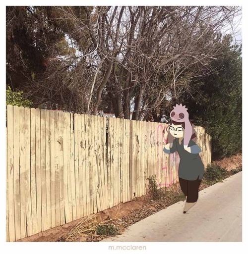 [Description: A photo of a sidewalk lined by a wooden fence. A cartoon of myself walks while carrying a Slakoth from Pokemon on my shoulders.]