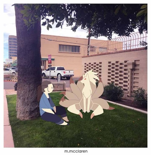 [Description: A photo of a little grass lawn. A cartoon of myself sits against a palm tree and looks over at a Ninetales from Pokemon.]