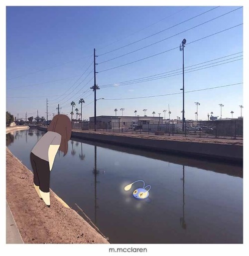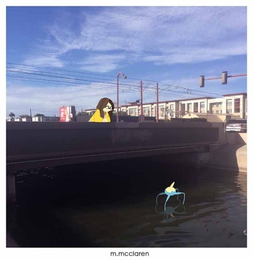 [Description: A photo of a canal. A cartoon of myself stands at the edge, looking down at a Chinchou from Pokemon.]