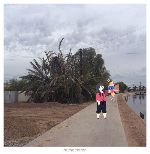 [Description: A photo of a canal. A cartoon of myself stands with a Carvanha from Pokemon hanging off my arm.]