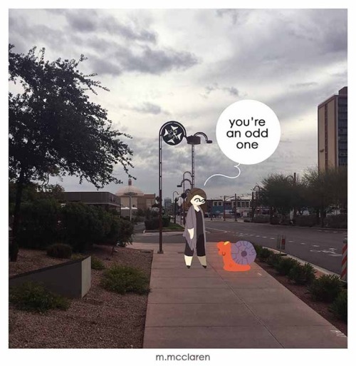 [Description: A photo of a sidewalk on an overcast day. A cartoon of myself stands looking down at a glowing Magcargo from Pokemon. The text reads: ‘You’re an odd one.’]