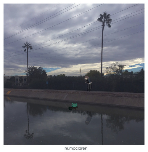 [Description: A photo of a canal. A cartoon of myself stands, looking down at a Qwilfish from Pokemon.]
