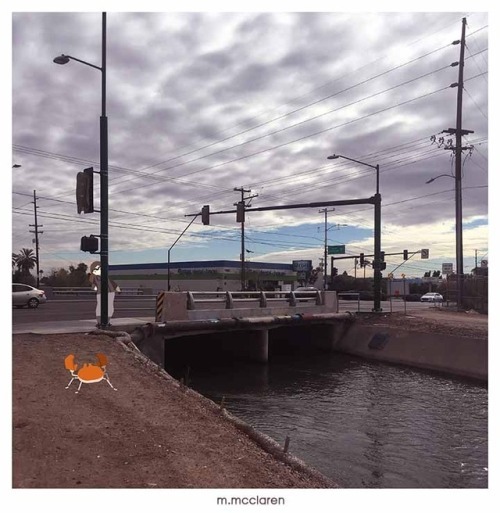 [Description: A photo of a canal with a street nearby. On one edge is a cartoon Krabby from Pokemon, approaching me as I hide behind a light post.]