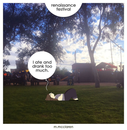 [Description: A series of photos depicting me at the Renaissance Festival. I am lying on the grass in the first two pictures. The text reads ‘I ate and drank too much.’ ‘Meredith! We’re getting more alcohol!’ To which I reply: ‘Wonderful. Help me find my feet so I can get more grenadine.’ The last picture shows me sipping a fruit cocktail and saying ‘Tha’s the good shit.’]