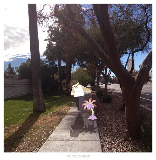 [Description: A photo of a sidewalk. A cartoon of myself inspects a Lileep from Pokemon.]