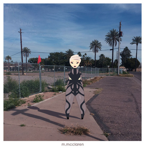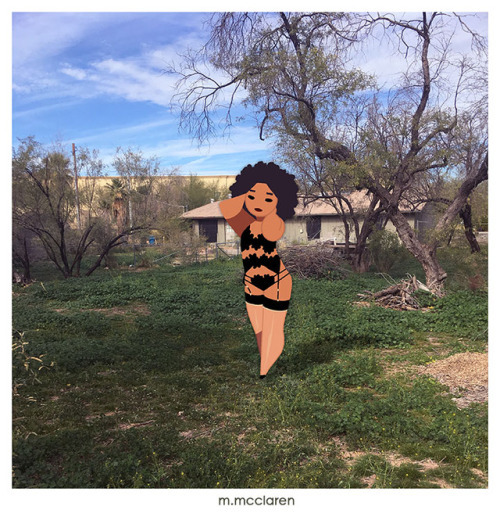 [Description: Three photos of streets and backyards. In each illustration is a cartoon modeling lingerie. In order: Simon Preen’s Cenobite Bodysuit, Playful Playmate, and Wolf and Whistle]