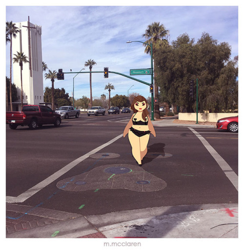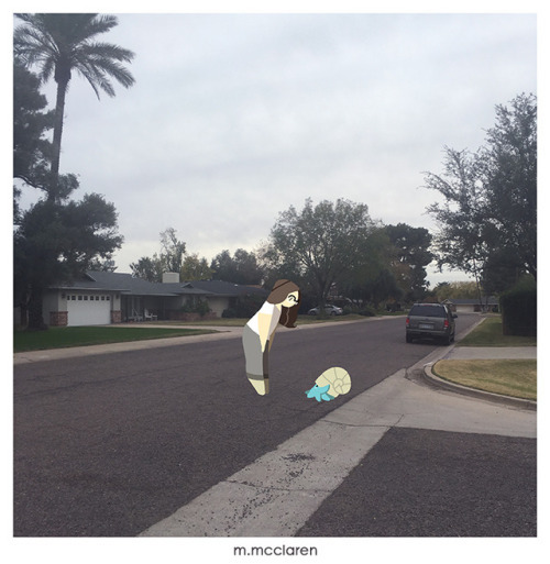 [Description: A photo of a neighborhood street corner. A cartoon of myself looks down at an Omanyte from Pokemon.]