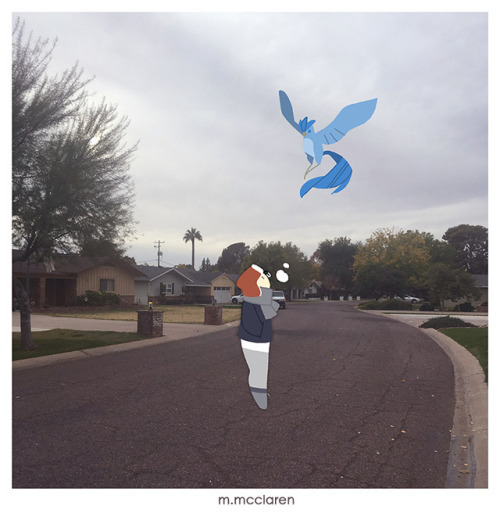 [Description: A photo of a neighborhood street. A cartoon of myself stands, bundled up for warmth, looking up at an Articuno from Pokemon.]