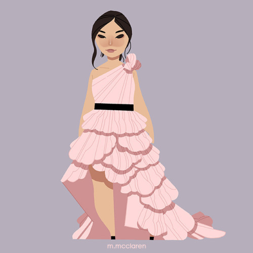 [Description: A cartoon rendering of Gemma Chan as she appeared at the SAG Awards 2019 wearing a pink frilly dress with black belt and shoes.]