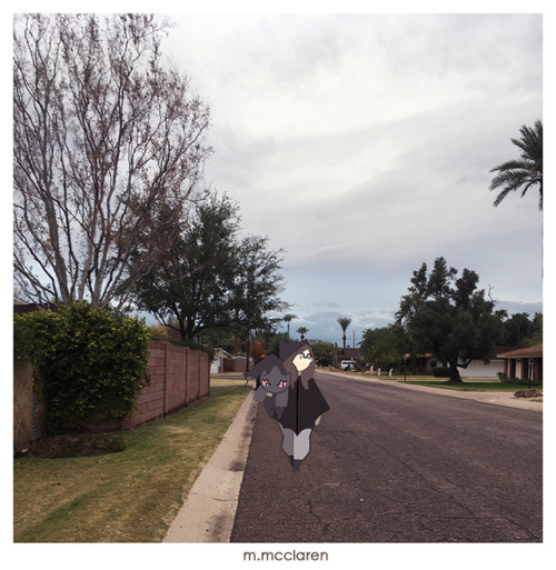 [Description: A photo of a neighborhood street. A cartoon of myself walks down the street carrying a Banette from Pokemon.]