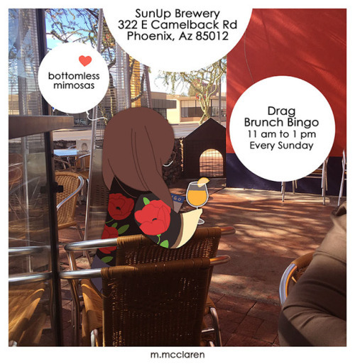 [Description: A photo of the open seating at SunUp Brewery. A cartoon of myself sits holding a mimosa in one hand and a bingo card in the other. The text reads: