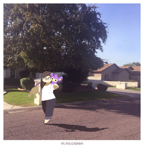 [Description: A photo of a neighborhood street. A cartoon of myself is walking with an Aipom from Pokemon on my shoulder.]
