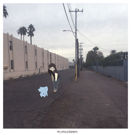 [Description: A photo behind an apartment complex. A cartoon of myself looks down at a Nidoran from Pokemon.]