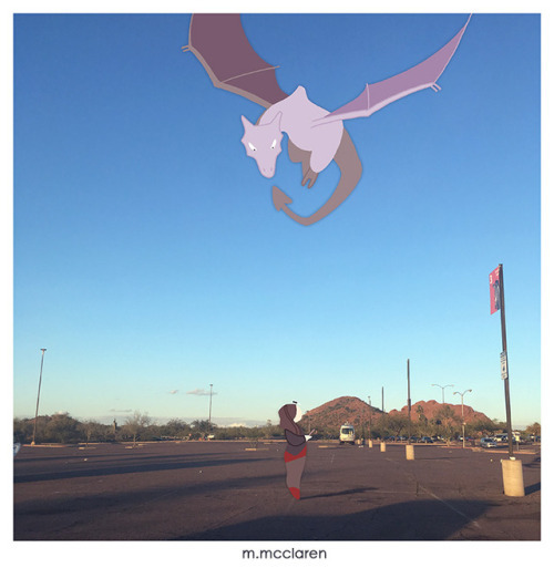 [Description: A photo of an empty parking lot. A cartoon of myself stands in the middle and looks up at an Aerodactyl from Pokemon flying overhead.]