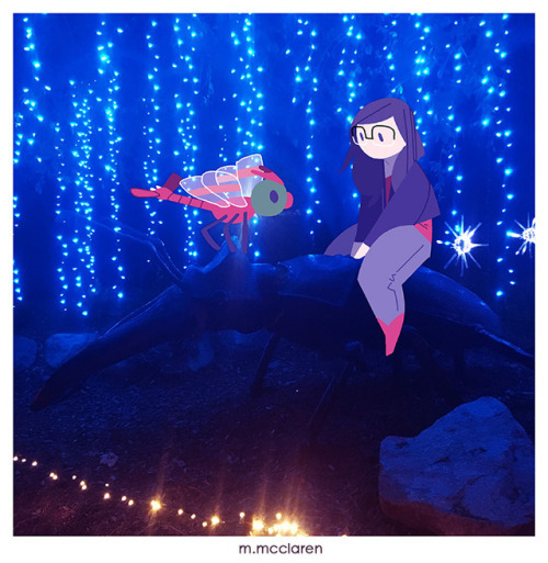 [Description: A photo of a giant beetle statue. Blue lights form a curtain behind it. A cartoon of myself and a Yanma from Pokemon sit on top of the beetle.]