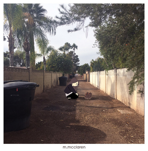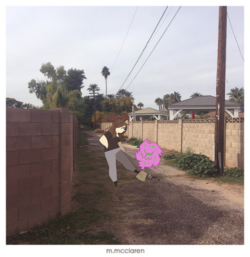 [Description: A photo of a neighborhood alley. A cartoon of myself kneels beside a Dugtrio from Pokemon.]