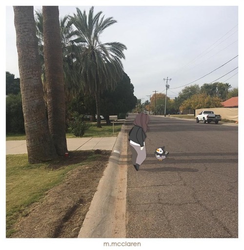 [Description: A photo of a neighborhood street. A cartoon of myself stands beside a Starly from Pokemon.]