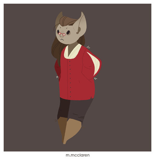 [Description: An illustration of myself as a goblin, with bat nose and ears. I’m wearing a red tunic with white sleeves peeking out, dark leggings, brown boots, and tiny red spectacles.]