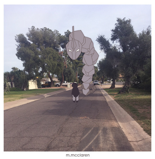 [Description: A photo of a neighborhood street. Down the street is a cartoon of myself looking up at an Onix from Pokemon.]