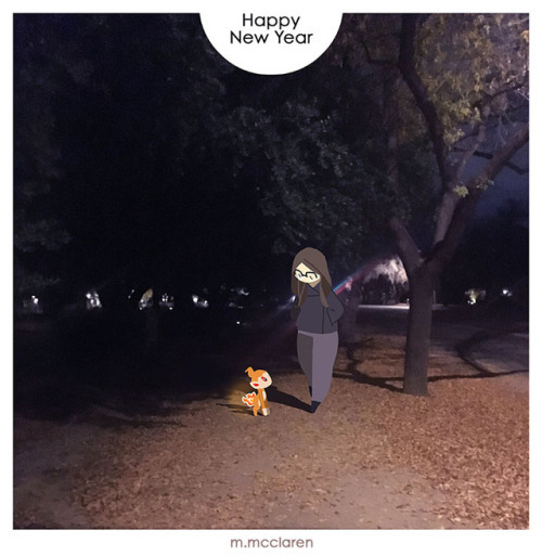 [Description: A photo of a gravel path at night. A cartoon of myself walks alongside a Chimchar from Pokemon. Text reads “Happy New Year.”]
