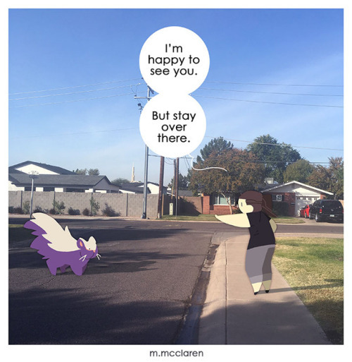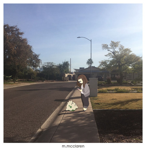 [Description: A photo of a neighborhood street. A cartoon of myself is standing on the sideway, arm outstretched to warn off a Stunky from Pokemon.]