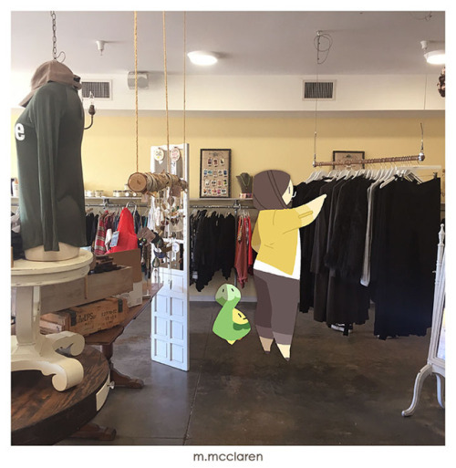 [Description: A photo of a small clothing boutique. A cartoon of myself is looking through the clothes. Standing beside me is a Budew from Pokemon.]