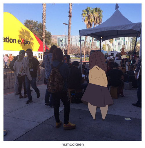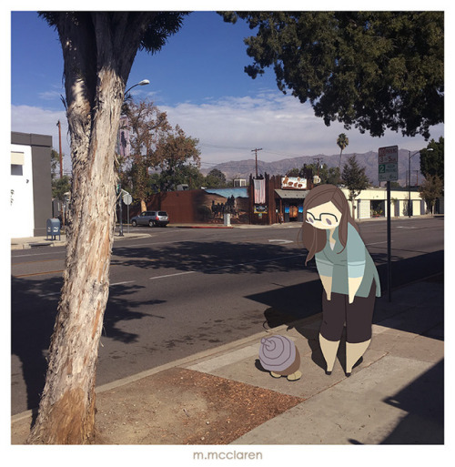 [Description: A photo of a Burbank street. A cartoon of myself is on the sidewalk, looking down at a Seedot from Pokemon.]