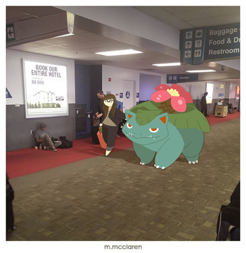 [Description: A photo of the Burbank Airport. A cartoon of myself is walking alongside a Venusaur from Pokemon.]