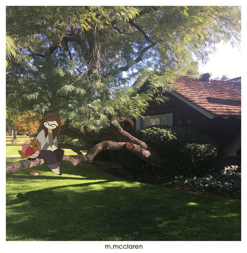 [Description: A photo of a home with a tree sporting low branches. Sitting on one of the branches is a cartoon of myself and a Spearow from Pokemon.]