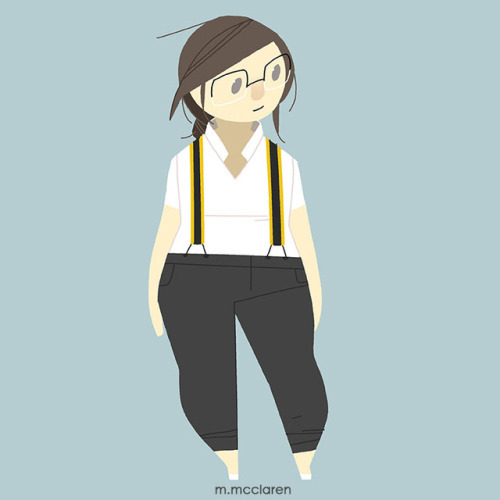 [Description: A cartoon of myself wearing a white shirt, dark pants, yellow and black striped suspenders, and white shoes.}