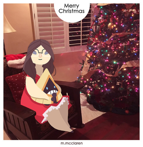 [Description: A photo of a Christmas tree lit up in a living room. A cartoon of myself is sitting in a rocking chair beside the tree. In my lap is a Snorunt from Pokemon.]
