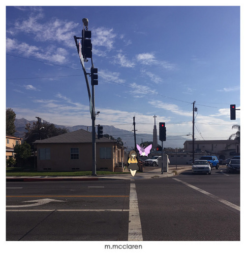 [Description: A photo of a street corner. In the distance is a cartoon of myself standing beside a Venomoth from Pokemon.]