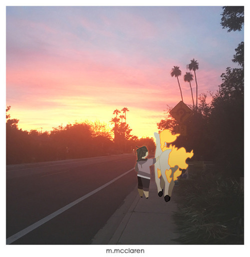 [Description: A photo of a street at sunset. A cartoon of myself is walking alongside a Ponyta from Pokemon.]