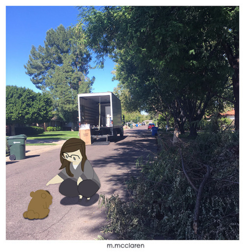 [Description: A photo of a neighborhood street. A cartoon of myself is kneeling in front of a Bidoof from Pokemon.]