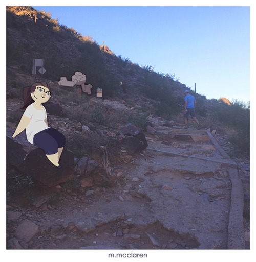 [Description: A photo of a desert hiking path. A cartoon of myself sits on a rock looking up at a Geodude from Pokemon.]