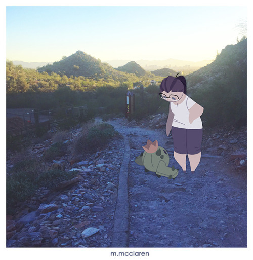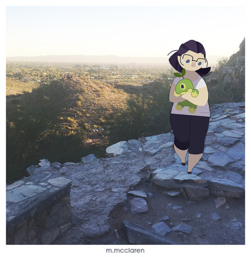 [Description: A photo of a desert hiking path. A cartoon of myself is walking down the path carrying a Turtwig from Pokemon.]
