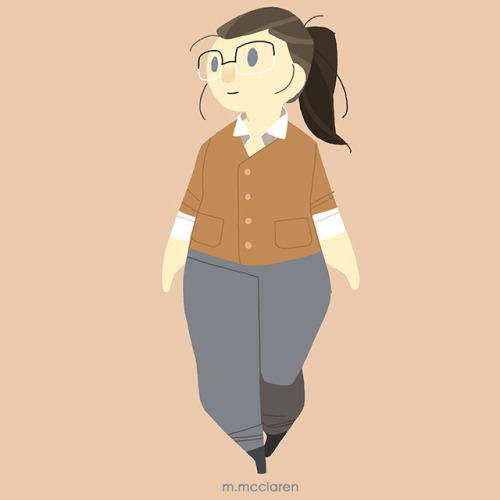 [Description: A cartoon of myself wearing dark boots, gray pants, a white blouse with a mustard yellow cardigan.]