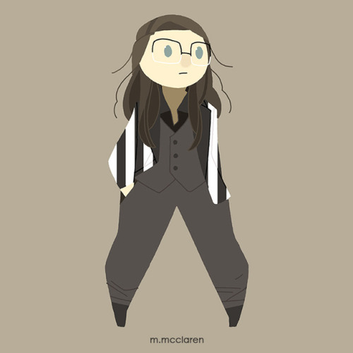 [Description: A cartoon of myself wearing dark boots, dark pants, a dark waistcoat, a black blouse, and a black and white vertically striped jacket.]