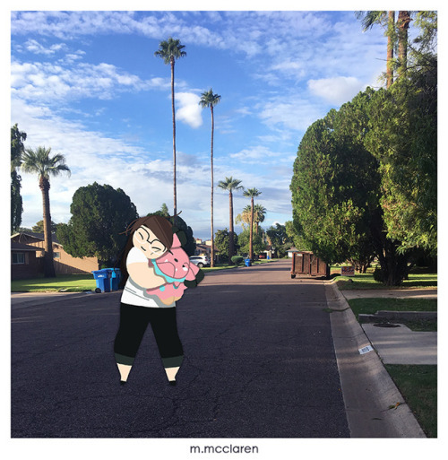 [Description: A photo of a neighborhood. A cartoon of myself holding up and snuggling a Snubbell from Pokemon is standing in the foreground.]