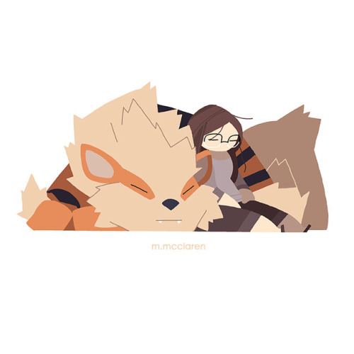 [Description: A cartoon of myself sleeping with an Arcanine from Pokemon curled around me.]