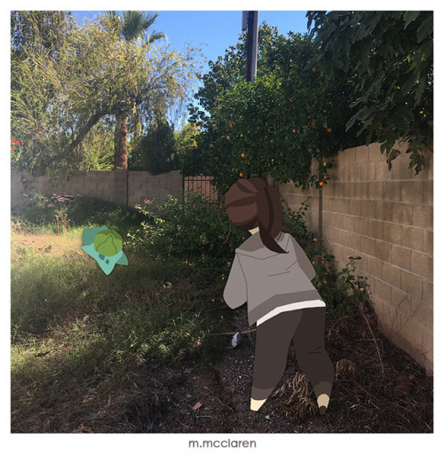 [Description: A photo of a front yard. A cartoon of myself is kneeling down to look at a Trapinch from Pokemon.]