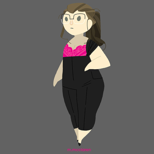 [Description: A cartoon of myself in a black jumpsuit with pink...