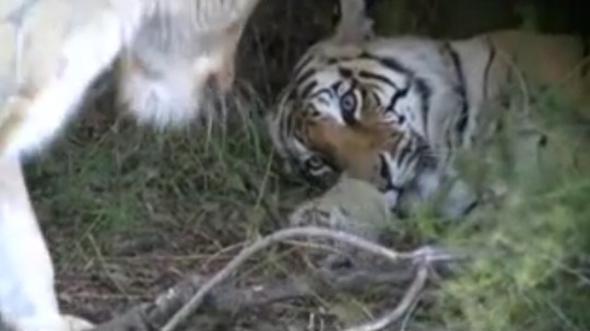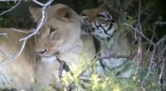 #that lion is the tiger’s daughter #momma loves her weird tiger daughter #sorry no lesbians but still cool #I like to think about a random asshole tiger coming in trying to start some shit with a younger smaller tiger and suddenly LION #who the fuck invited the lion and why is she kicking my ass