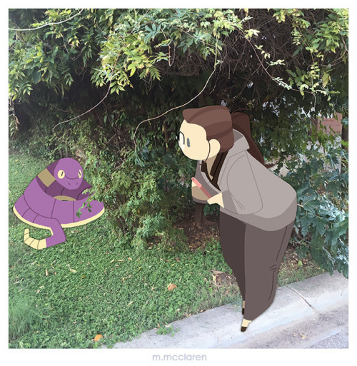 [Description: A cartoon version of myself in a grey sweater and darker pants peering around some shrubs at an Ekans from Pokemon.]