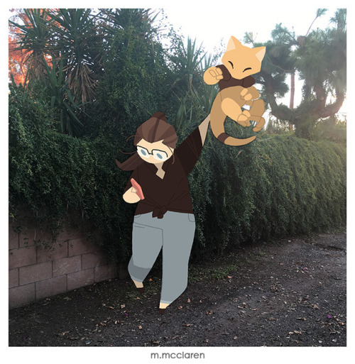 [Description: A cartoon version of myself wearing a black blouse and blue jeans. I am looking at my phone in one hand and holding onto the tail of an Abra from Pokemon with the other. Behind us is the photo of a mossy wall and palm trees.]