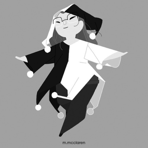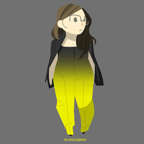 [Description: A cartoon version of myself wearing a jumpsuit that starts as black on the top and yellow at the bottom. A dark jacket is hanging on my shoulders.]