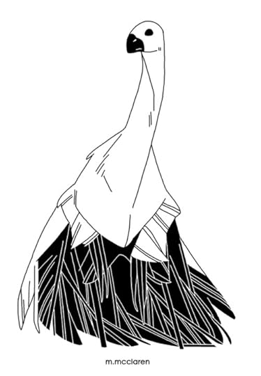 [Description: A black and white illustration of the cryptid Kaiaimunu. It looks like a Moa with claws and a full, wide feathered tail.]