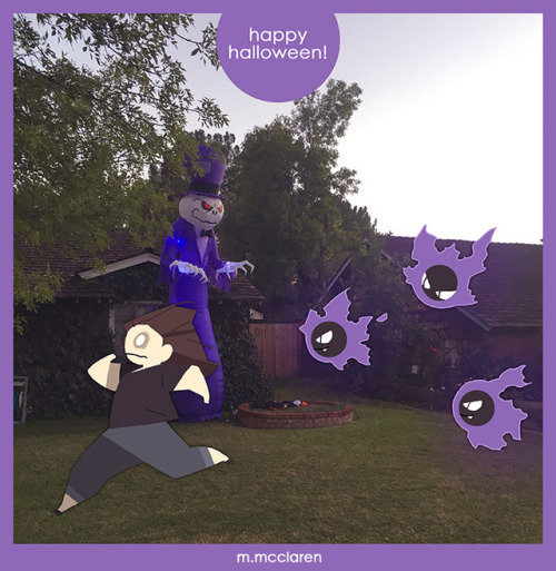 [Description: A photo of a front yard decorated for Halloween. A cartoon version of myself wearing jeans and a dark shirt runs towards the audiences’ left, away from three Gastlys from Pokemon.]