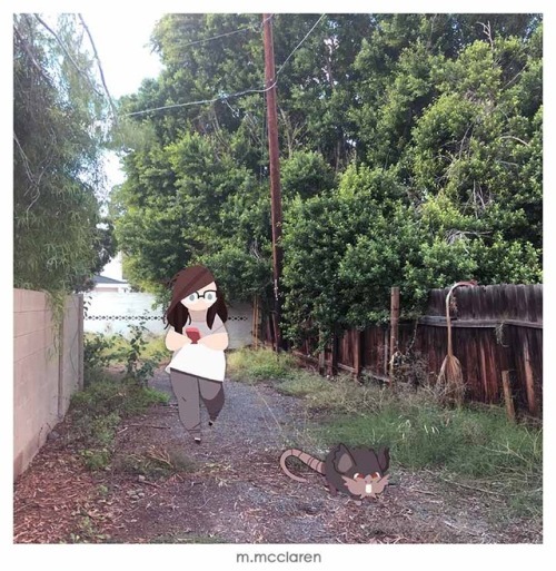 [Description: A cartoon version of myself walking in an alleyway. I’m wearing a white shirt and grey jeans. I’m walking behind a Alolan Raticate.]