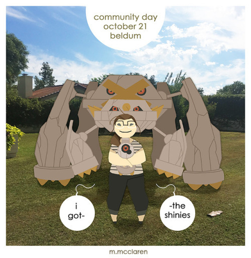 [Description: A cartoon version of myself wearing a striped shirt and dark jeans standing on a grassy lawn. I am holding a Shiny Beldum, and behind me is a Shiny Metang and Metagross from Pokemon. There is a caption reading ‘Community Day, October 21, Beldum.’ And I am smiling as I say ‘I got the shinies.’]